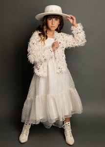 Let your little one shine in our enchanting glitter dot dress adorned with playful ruffles. Featuring a stylish high-low hem and a maxi length, this dress is perfect for twirling at any event. The adjustable spaghetti straps and off-the-shoulder elastic straps ensure a comfortable and trendy fit. An invisible back zipper with a hook & eye closure makes dressing a breeze, while the fully lined body adds extra comfort. Ideal for parties, special occasions, or just for fun, this dress is a must-have for her wardrobe!
