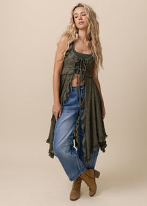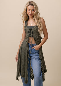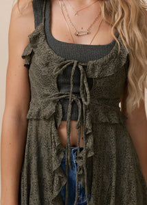 The Cicley Top is designed to make a statement with its flattering, elongated silhouette and feminine details. A center-front lace-up closure with an adjustable tie lets you customize the fit while adding a touch of charm. Ruffle trim frames the neckline and continues down the front, creating soft movement and texture. Gentle gathering at the bust enhances the shape, while thin spaghetti straps keep the look light and delicate. Finished with a flowing handkerchief hem, this boutique top brings effortless elegance to any outfit.