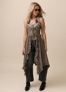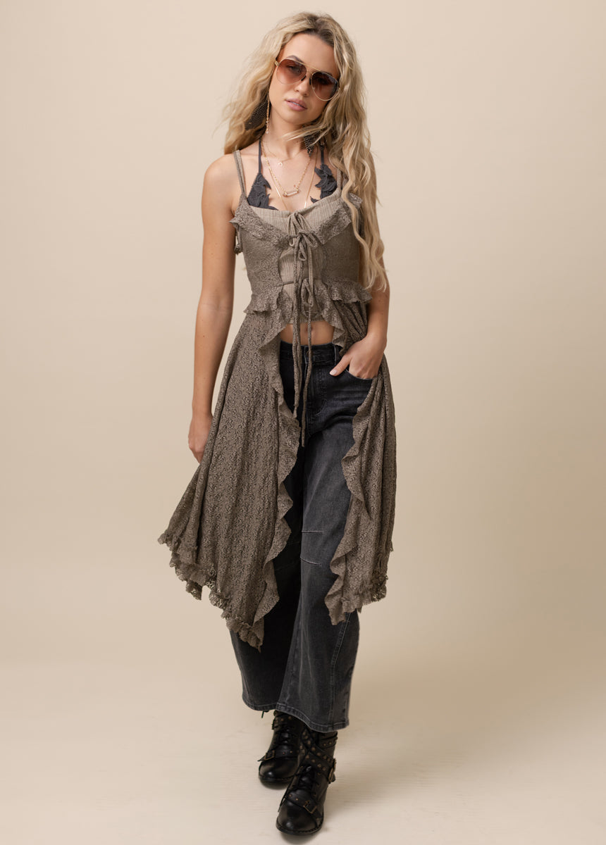 The Cicley Top is designed to make a statement with its flattering, elongated silhouette and feminine details. A center-front lace-up closure with an adjustable tie lets you customize the fit while adding a touch of charm. Ruffle trim frames the neckline and continues down the front, creating soft movement and texture. Gentle gathering at the bust enhances the shape, while thin spaghetti straps keep the look light and delicate. Finished with a flowing handkerchief hem, this boutique top brings effortless elegance to any outfit.