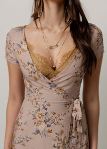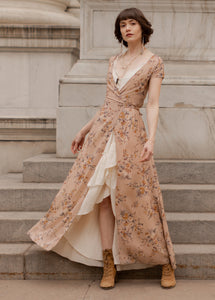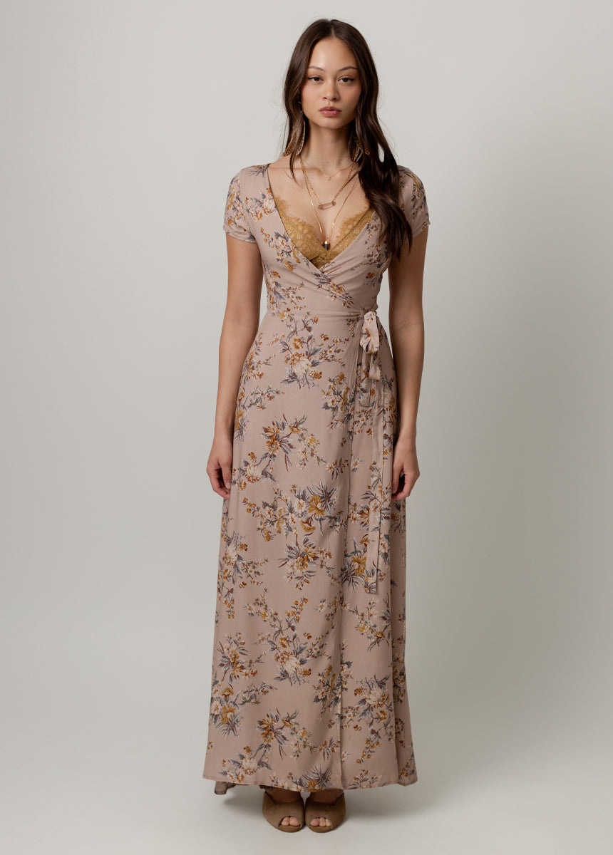 This effortless wrap dress fully opens and secures with a wide, double-layer self-fabric belt, giving you a custom fit every time. The V-neckline and short sleeves, finished with a clean 1/2-inch hem, create a soft and flattering silhouette. A defined waist seam sits neatly beneath the belt for a smooth, polished look. The wrap skirt opens completely and features a shaped slit that adds movement and a touch of allure. Finished with a tidy 1/2-inch hem, this dress blends comfort, elegance, and easy everyday sophistication.