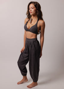 These stylish pants bring together comfort and modern flair with a flattering high-rise waistband that elongates the silhouette. The flat front waistband keeps the look polished, while the elasticized back adds all-day ease and flexibility. A relaxed, oversized fit pairs beautifully with soft draping through the legs, giving the pants a breezy, effortless feel. Side seam pockets make them as practical as they are chic. Finished with elasticated ankle cuffs that create a gently gathered, cinched hem, these boutique-ready pants are perfect for anyone who loves elevated everyday style.