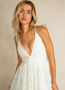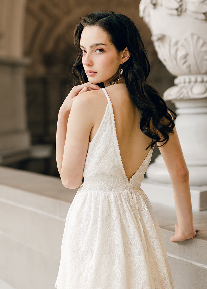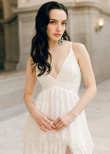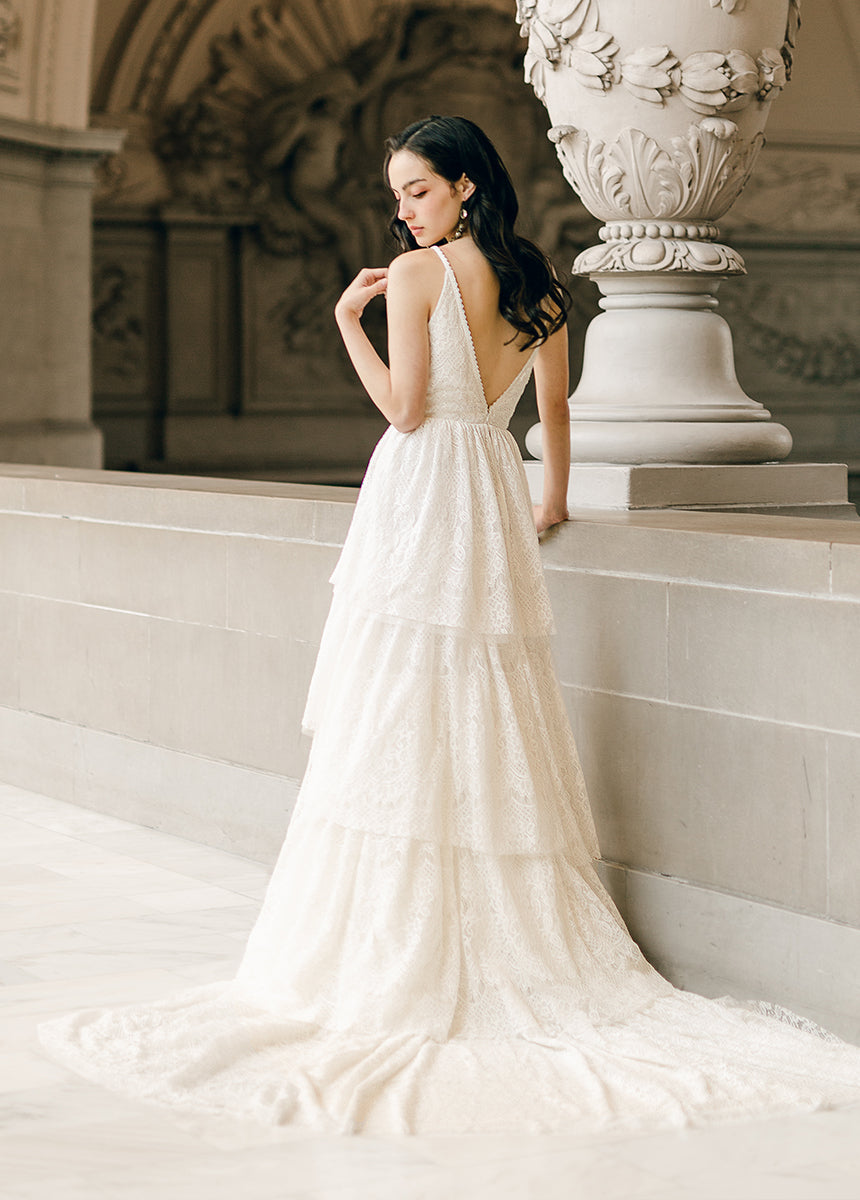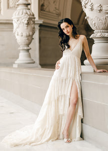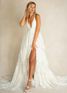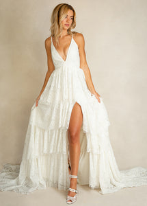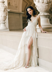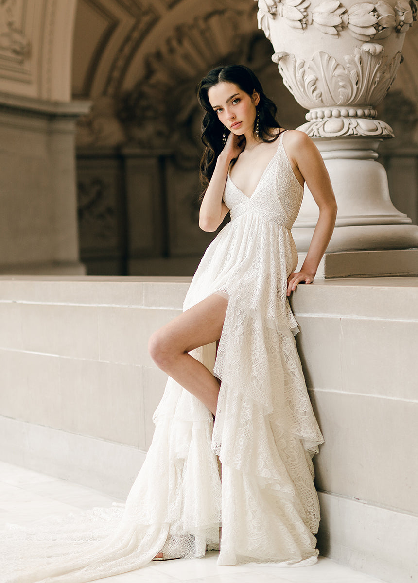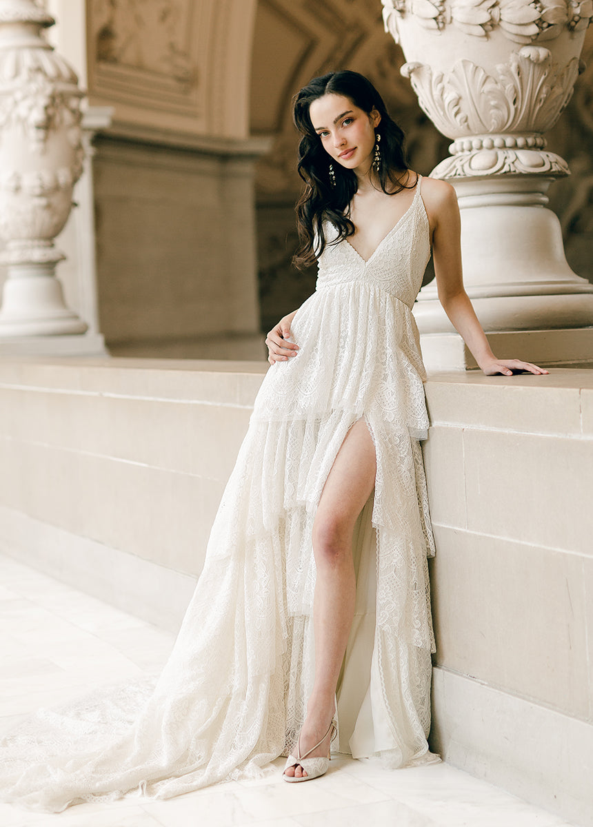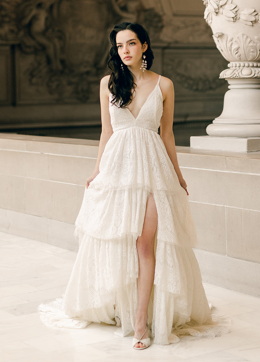 Meet Cordelia, a lacy dream for the sweet and inspiring bride. This gown features a beautiful tiered silhouette and unique open neckline. The lace trim details are delicately subtle but add to the gown exquisitely. An open back and leg slit create the perfect dose of allure. Cordelia is a stunning blend of sweetness and elegance, sure to make any bride feel as beautiful as they are.