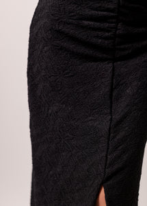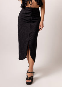 This chic calf-length skirt is designed with a sleek center-front seam that instantly elongates the silhouette. Soft ruching gathered along the front adds a flattering, feminine touch that draws the eye in all the right ways. A center-front slit brings easy movement and a hint of modern edge, perfect for day-to-night styling. The curved back hem creates a smooth, graceful finish that enhances the skirt’s elegant shape. Effortlessly stylish and boutique-worthy, it’s a polished piece that elevates any wardrobe.