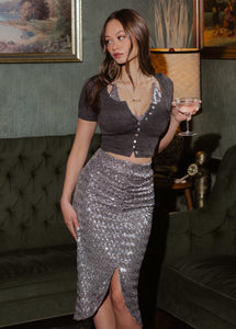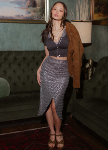 This chic calf-length skirt is designed with a sleek center-front seam that instantly elongates the silhouette. Soft ruching gathered along the front adds a flattering, feminine touch that draws the eye in all the right ways. A center-front slit brings easy movement and a hint of modern edge, perfect for day-to-night styling. The curved back hem creates a smooth, graceful finish that enhances the skirt’s elegant shape. Effortlessly stylish and boutique-worthy, it’s a polished piece that elevates any wardrobe.