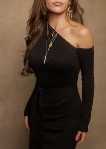 This chic one-shoulder dress blends modern elegance with a beautifully feminine silhouette. It features a striking one-shoulder neckline and a self-tie waist belt that lets you define your shape with ease. The asymmetric wrap skirt drapes softly in the front, creating a flattering flow that moves gracefully with every step. An angled hemline and subtle side slit add a touch of drama while keeping the look refined. Finished at a classic midi length, this dress is perfect for boutique lovers who want something effortlessly stylish and unique.