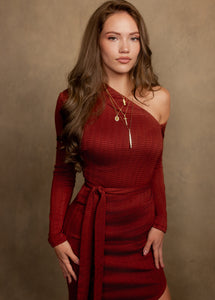 This chic one-shoulder dress blends modern elegance with a beautifully feminine silhouette. It features a striking one-shoulder neckline and a self-tie waist belt that lets you define your shape with ease. The asymmetric wrap skirt drapes softly in the front, creating a flattering flow that moves gracefully with every step. An angled hemline and subtle side slit add a touch of drama while keeping the look refined. Finished at a classic midi length, this dress is perfect for boutique lovers who want something effortlessly stylish and unique.