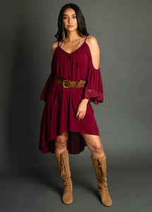 The Dela Dress in Oxblood effortlessly combines comfort and versatility for your wardrobe. With its flowy silhouette and boho vibes, this dress is perfect for any occasion, from casual outings to special events. Featuring a stylish mini to midi high-low hem and an A-line silhouette, it flatters all body types. The cold shoulder design and V-neck add a trendy touch, while the low back and adjustable straps ensure a customized fit. Complete with a removable belt and fully lined for added comfort, the Dela Dress will quickly become your go-to favorite!