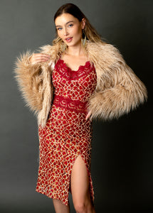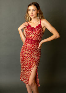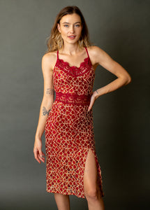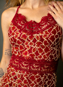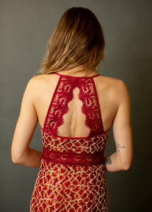 A chic and shimmery form-fitting lace dress with crochet lace details on the neckline, waist, and back cut out.