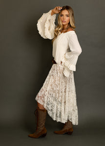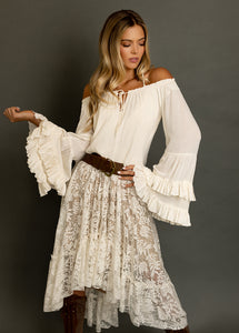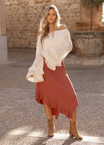 Elevate your wardrobe with our versatile long sleeve Devina Top, perfect for any occasion! Featuring stylish bell sleeves with ruffles, this top can be worn on or off the shoulder for a customizable look. The elastic boat neck and front keyhole opening add a touch of elegance, while the functional front tie enhances its relaxed fit. The trendy high-low hem ensures you can easily dress it up or down to suit your style. Pair it with anything in your closet for effortless chic!