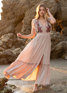 The Diah Dress in Light Taupe is great for any event, featuring flutter sleeves and detailed embroidery that brings a fun and stylish element to your closet with ease.