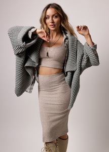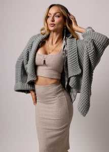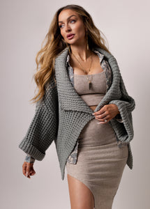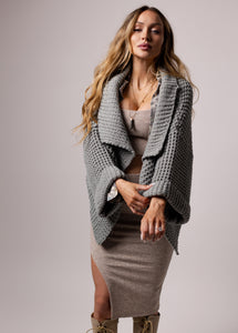 The Doni Sweater is designed with a wide, shawl-style collar that adds effortless warmth and elegance. The sleeves are wide and loose with deep armholes, giving it a relaxed, comfortable drape that’s perfect for layering. Discreet hook-and-eye closure lets you wear it open or lightly fastened for a polished look. The high–low hemline creates flattering movement and a modern silhouette that pairs beautifully with jeans, leggings, or skirts. Soft, stylish, and easy to wear, this sweater is the perfect statement layer for cooler days.