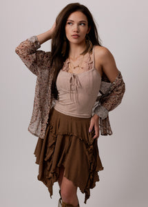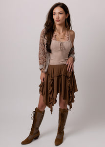 The Edna Skirt brings effortless movement and charm to any outfit. It features a high-stretch, low-resistance elastic waistband that feels soft and comfortable while giving you a flexible, flattering fit. Sewn-in flounce detailing adds beautiful flow with every step, creating that boutique-worthy feminine touch. The back is cut slightly longer than the front for a subtle high-low effect that keeps the silhouette chic and balanced. Finished with a handkerchief hem, this skirt delivers a stylish, modern look that’s perfect for dressing up or keeping casual.