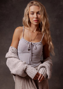 This stylish top features slim spaghetti straps and a charming front tie detail that adds a playful, feminine touch. The slightly ruched center front creates a flattering shape that enhances your natural curves. Designed with a fitted silhouette, it hugs the body beautifully for a sleek, confident look. The cropped length hits perfectly above the waist, making it ideal for pairing with high-rise jeans or skirts. Whether dressed up or kept casual, this piece adds effortless allure to any outfit.