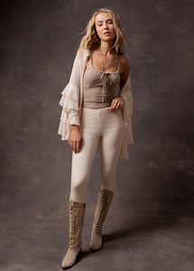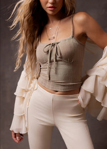 This stylish top features slim spaghetti straps and a charming front tie detail that adds a playful, feminine touch. The slightly ruched center front creates a flattering shape that enhances your natural curves. Designed with a fitted silhouette, it hugs the body beautifully for a sleek, confident look. The cropped length hits perfectly above the waist, making it ideal for pairing with high-rise jeans or skirts. Whether dressed up or kept casual, this piece adds effortless allure to any outfit.