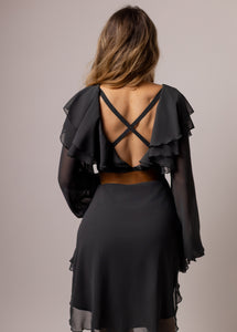 The Elide Dress blends romantic detailing with a flattering, modern silhouette, making it a standout piece for any boutique wardrobe. A deep V-neckline at both the front and back adds elegant drama, supported by discreet silicone grip tape to help keep everything perfectly in place. Softly draped high–low hemline pairs beautifully with cascading ruffles—two tiers framing the neckline and shoulders, plus angled and vertical ruffles that highlight the waist and skirt for a sculpted, feminine look. The long sleeves are gently gathered at the wrists with hidden elastic for an effortless finish. Every hem and ruffle edge is completed with delicate lettuce-edge stitching, adding a touch of airy movement to this beautifully detailed dress.