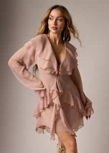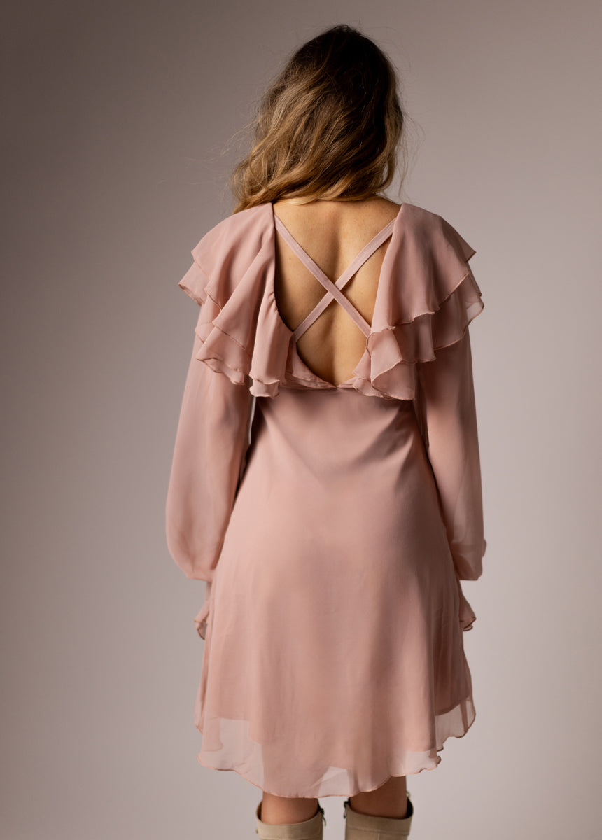 The Elide Dress blends romantic detailing with a flattering, modern silhouette, making it a standout piece for any boutique wardrobe. A deep V-neckline at both the front and back adds elegant drama, supported by discreet silicone grip tape to help keep everything perfectly in place. Softly draped high–low hemline pairs beautifully with cascading ruffles—two tiers framing the neckline and shoulders, plus angled and vertical ruffles that highlight the waist and skirt for a sculpted, feminine look. The long sleeves are gently gathered at the wrists with hidden elastic for an effortless finish. Every hem and ruffle edge is completed with delicate lettuce-edge stitching, adding a touch of airy movement to this beautifully detailed dress.