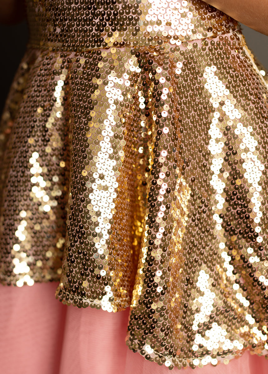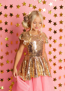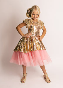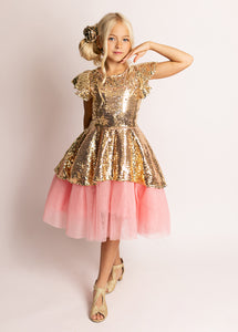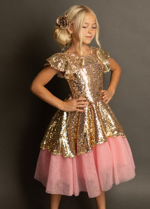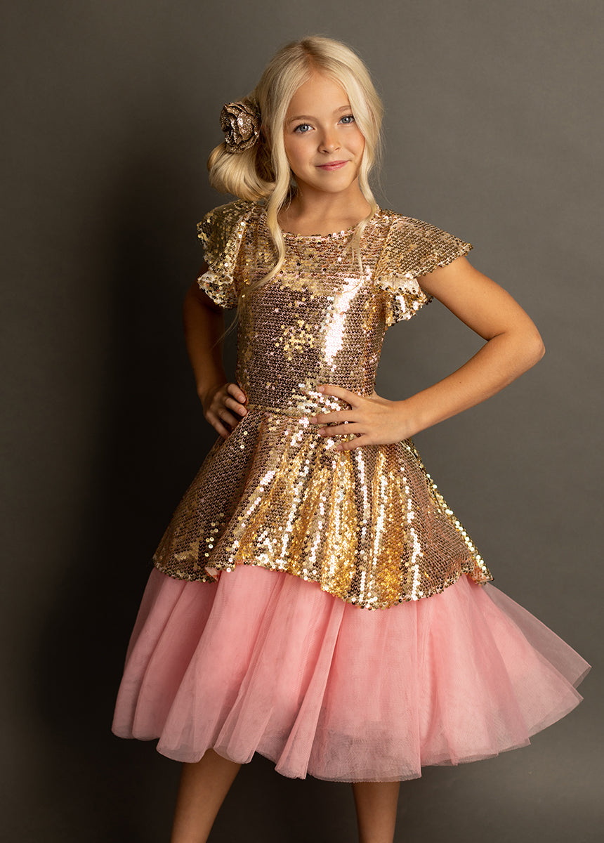 Make your little one's dreams come true with our enchanting Elsbeth Dress crafted from gold sequins and pink tulle! This stunning dress features a high-low petticoat skirt that adds a playful touch to any special occasion. The boat neckline and flutter sleeves create a charming silhouette, while the fully lined body ensures comfort and style. A convenient back zipper with a hook and eye closure makes dressing easy and hassle-free. Perfect for parties or dress-up play, this magical dress is sure to delight!