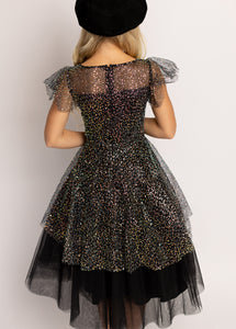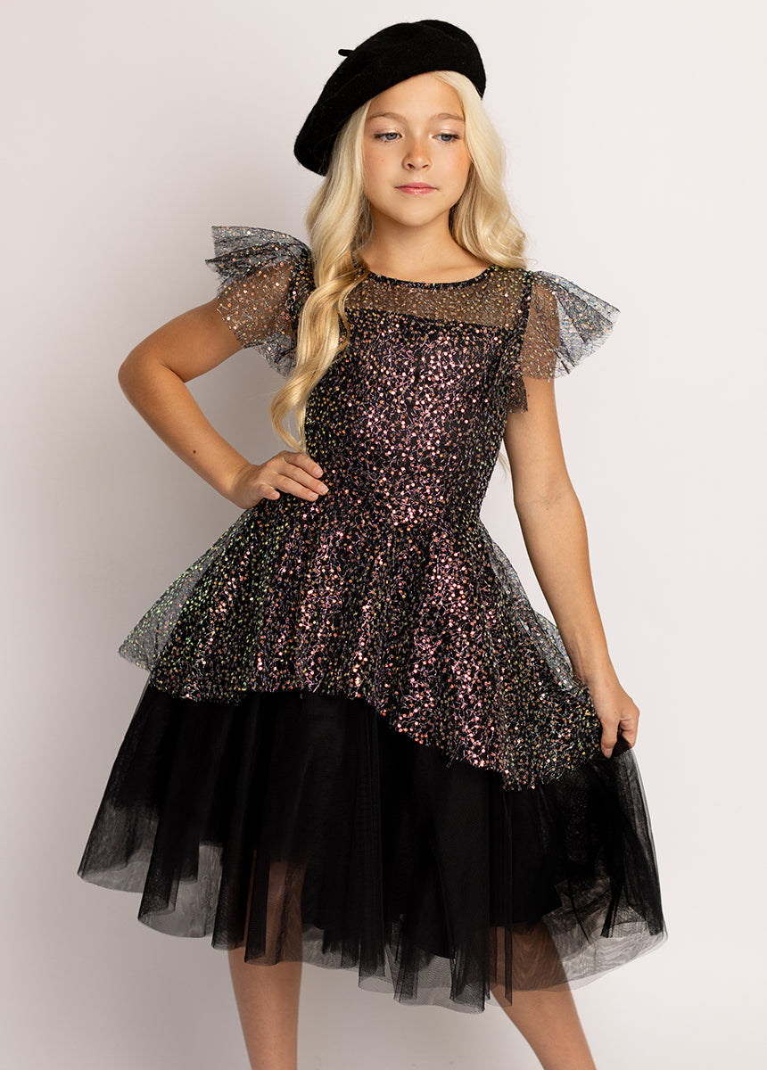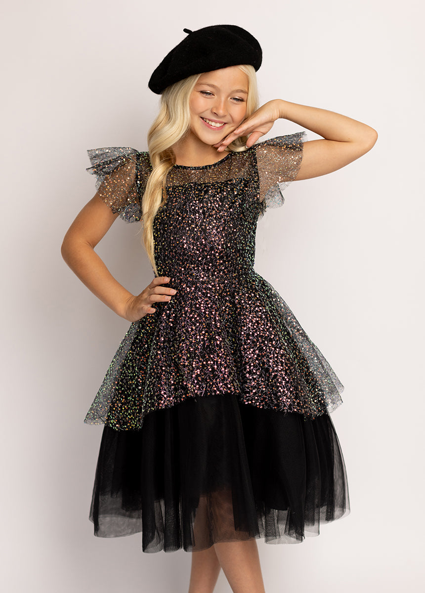 Make your little one's dreams come true with our enchanting Elsbeth Dress crafted from iridescent sequins and tulle! This stunning dress features a high-low petticoat skirt that adds a playful touch to any special occasion. The boat neckline and flutter sleeves create a charming silhouette, while the fully lined body ensures comfort and style. A convenient back zipper with a hook and eye closure makes dressing easy and hassle-free. Perfect for parties or dress-up play, this magical dress is sure to delight!
