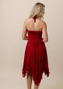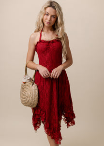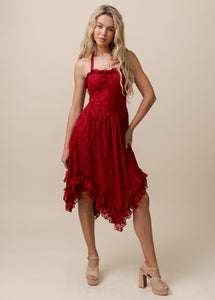 The Erma Dress is designed to turn heads with its delicate ruffle trim framing the neckline. The open upper back adds an elegant, airy touch that balances the structured silhouette beautifully. A fitted bodice with vertical seam panels creates flattering shaping, with seams forming a subtle V at the waist to highlight your natural curves. Layered ruffles follow the hemline, adding movement and soft texture to the design. Finished with an uneven hem, this boutique dress brings modern femininity and effortless elegance to any occasion.