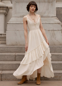 Discover elegance with Everlie Dress, featuring stunning skirt ruffles, lace detailed bodice, and a charming self-tie bow at the back. Inspired by our beloved Christelle Dress, this design blends timeless beauty with intricate details, making it a standout choice for any special occasion. Elevate your style with this enchanting dress that combines grace and sophistication.