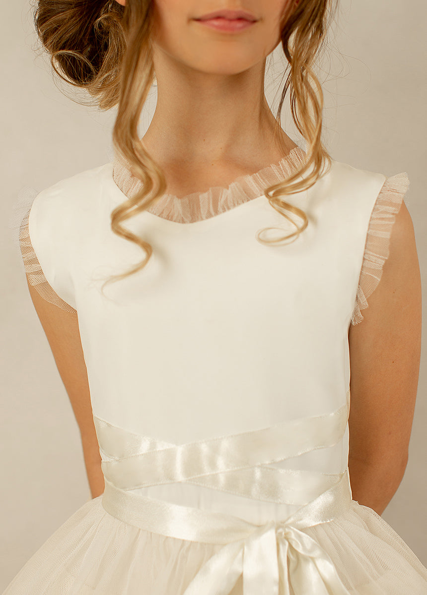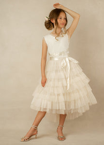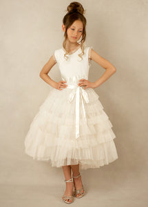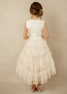 This charming petticoat dress is perfect for your little flower girl. The dress features a beautiful full ruffle skirt that gives a dreamy look, a chiffon bow at the waist that adds a touch of elegance, and a high-low silhouette that is both playful and trendy. It's a perfect dress for any occasion and will make your little girl look and feel special.