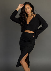 Elevate your wardrobe with the black Fable set, designed for busy days when comfort meets style. This versatile outfit features a long sleeve V-neck top with slight bell sleeves, making it perfect for any occasion. The midi-length skirt hugs your figure with a flattering tight fit and a daring leg slit for added flair. Whether you wear the pieces together or mix and match, convenience is at your fingertips. Discover the ideal blend of comfort and sophistication with the Fable set today!