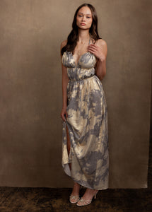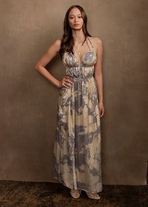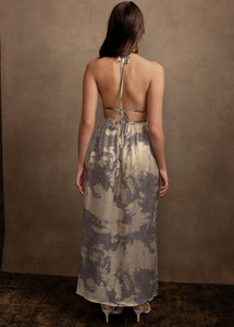 This dress captures effortless elegance with its open-back design and delicate strap detailing. The deep V-neckline with gathered bust accents creates a flattering, feminine silhouette. Spaghetti tie halter straps add a touch of charm while ensuring an adjustable, comfortable fit. The long flowing skirt with a front slit brings graceful movement and a subtle hint of allure. Finished with a clean straight hem, this dress is perfect for special occasions or a romantic evening out.