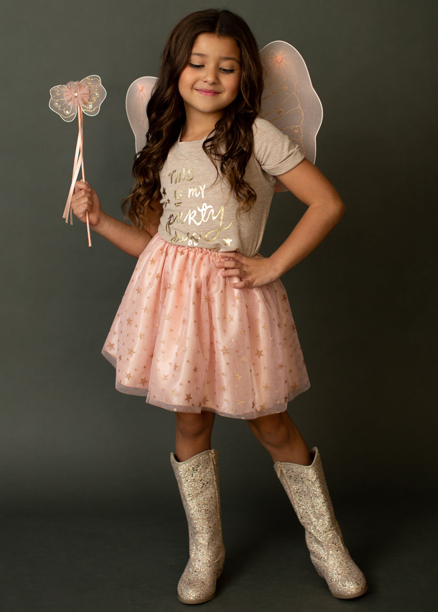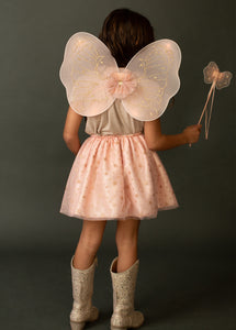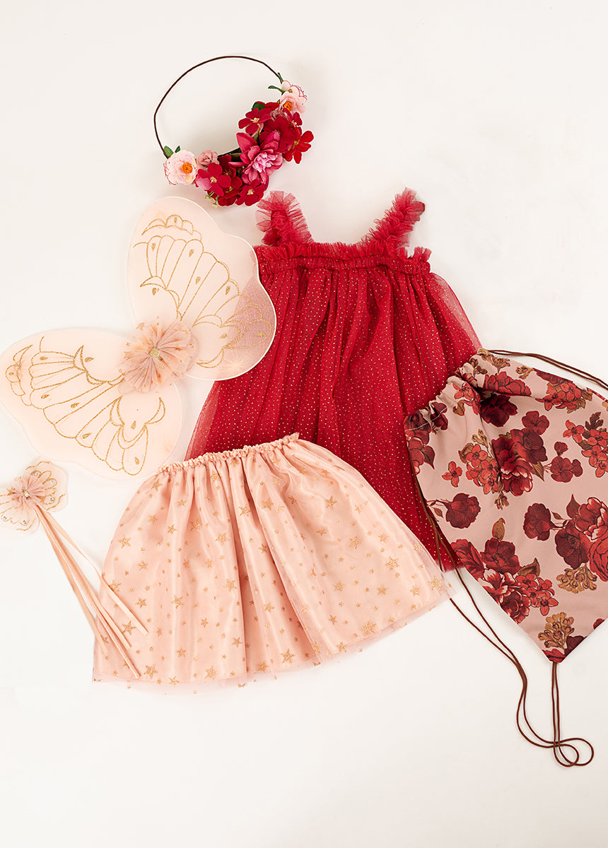 Shop the perfect gift to make her day full of magic! This gift set includes a sparkly scarlet color dress and matching flower crown, magical matching fairy wings, skirt and wand and a floral drawstring backpack. The total retail value is $148.