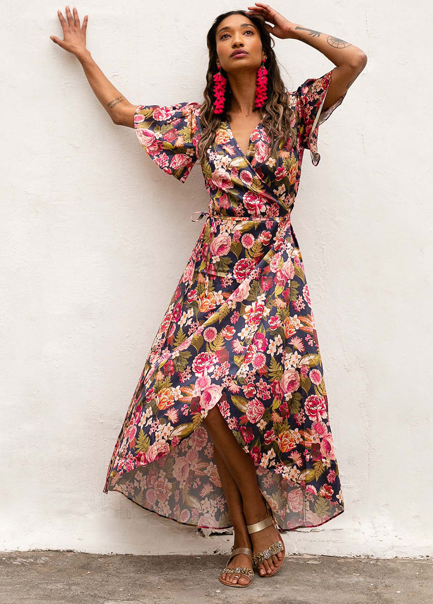 On-trend silk functional wrap midi dress for personalized comfort & style.