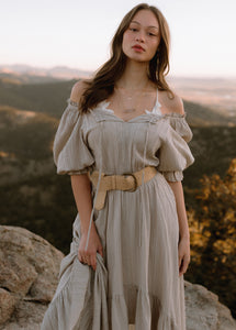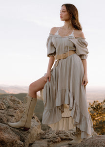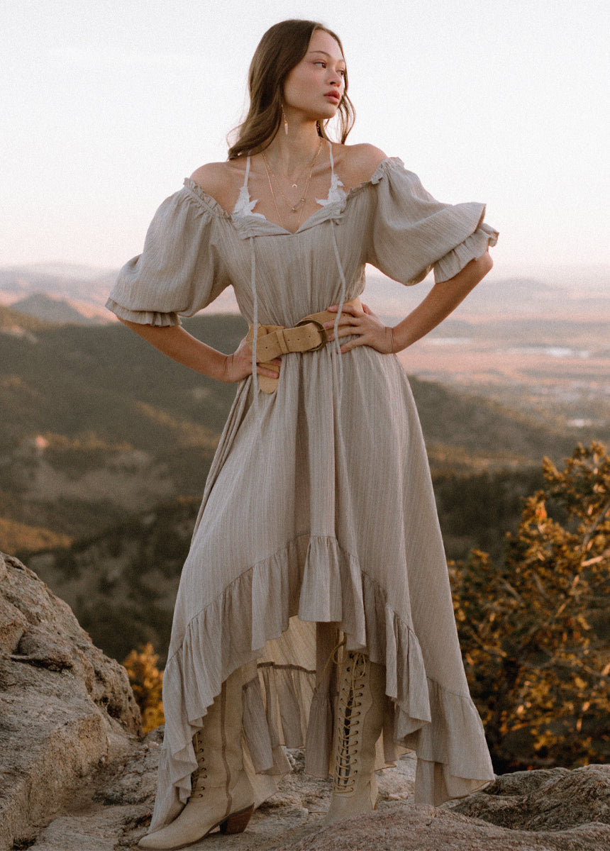 Discover the perfect blend of timeless elegance and contemporary flair with the Gwenaelle Dress in Khaki. This stunning maxi dress features a striking high-low hemline that adds a unique twist, making it suitable for both casual outings and special occasions. The smocked waist provides a flattering fit, while the functional self-tie bow at the neckline adds a charming detail. Crafted for versatility, this dress can be dressed up or down to suit any event. Elevate your wardrobe with the eye-catching Gwenaelle Dress, where style meets sophistication!