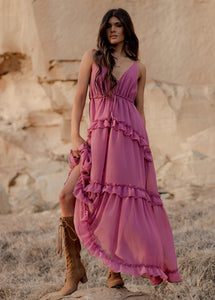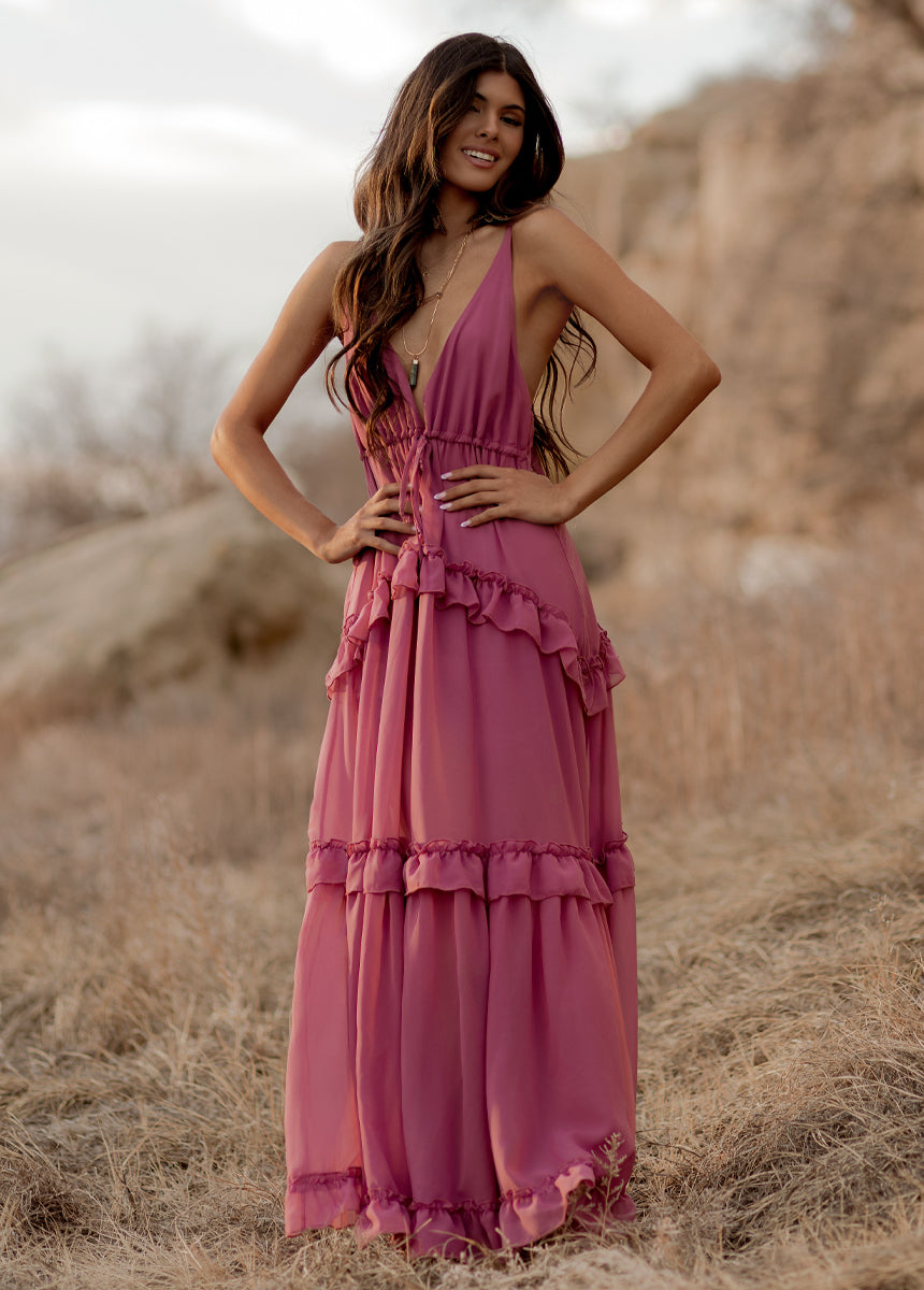 The Hadleigh Dress features a delicate lingerie-inspired bodice that brings a soft, feminine charm to your look. Adjustable shoulder straps with subtle strap adjusters allow for a customized and comfortable fit. A self-fabric drawcord at the waist creates gentle gathering, defining the silhouette while keeping it effortlessly relaxed. The full-length skirt is designed with multiple horizontal ruffle tiers that add movement, volume, and romantic flair. Perfect for warm-weather outings, vacations, or special occasions, this maxi dress blends elegance with easy, wearable comfort.