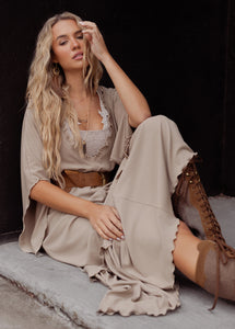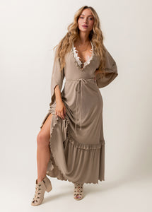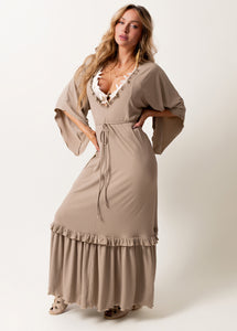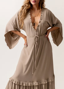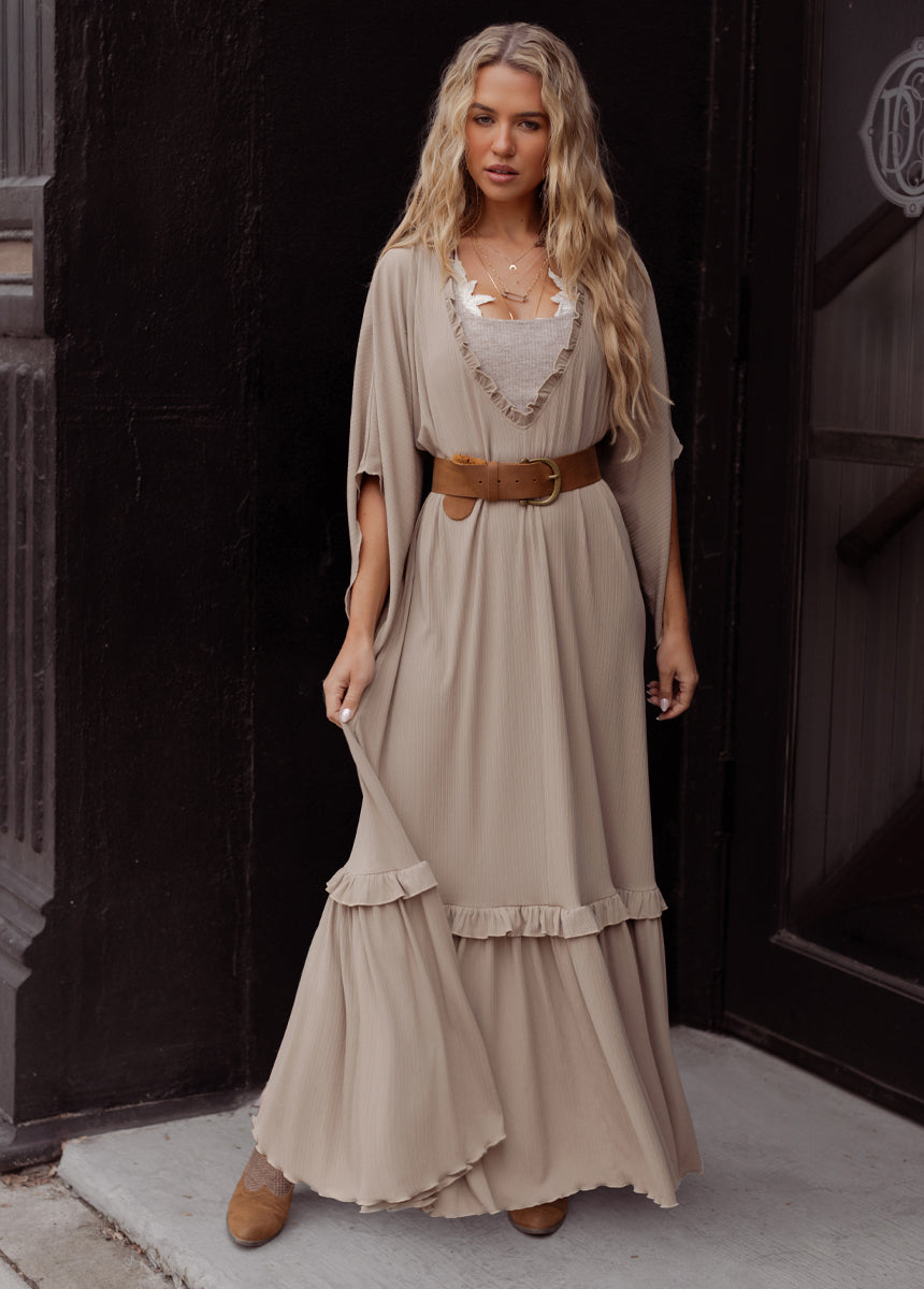 This dress features a romantic ruffled neckline that adds soft, feminine charm. The high-low, wide sleeves create a flowy silhouette with effortless movement and style. A self-fabric drawcord with delicate loops allows you to cinch the waist for a customised fit. Designed for comfort and versatility, it’s perfect for casual days, brunch outings, or chic vacation looks. A must-have for any women’s boutique collection, this ruffled dress blends timeless elegance with modern ease.