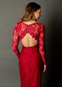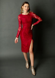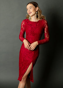 An elegant form-fitting midi dress with stunning lace and crocheted details.
