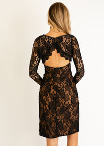 An elegant form-fitting midi dress with stunning lace and crocheted details.