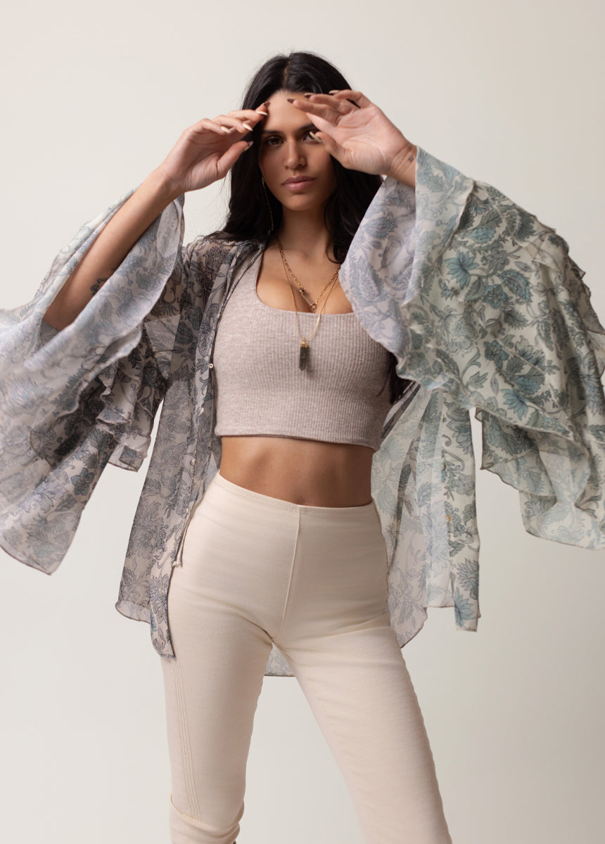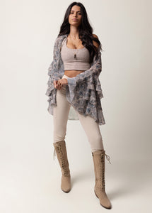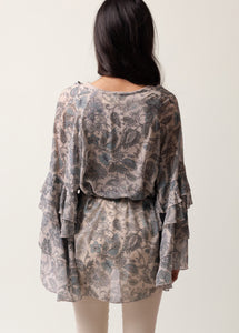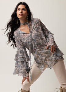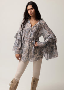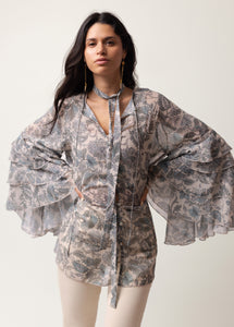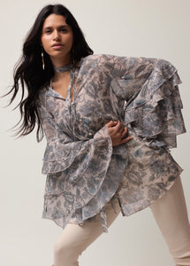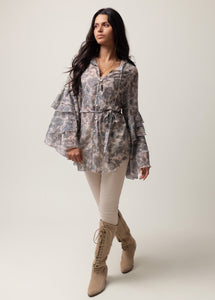 This blouse features a deep keyhole neckline with a delicate tie that adds a soft, feminine touch. The raglan sleeves steal the show with four tiers of cascading ruffles, giving the piece beautiful texture and movement. A button-down front keeps the look classic, while the self-fabric belt cinches the waist for a flattering fit. Threaded belt loops hold the belt neatly in place, adding both function and style. Perfect for pairing with skirts, denim, or tailored trousers, this boutique blouse is a versatile statement piece for modern women.