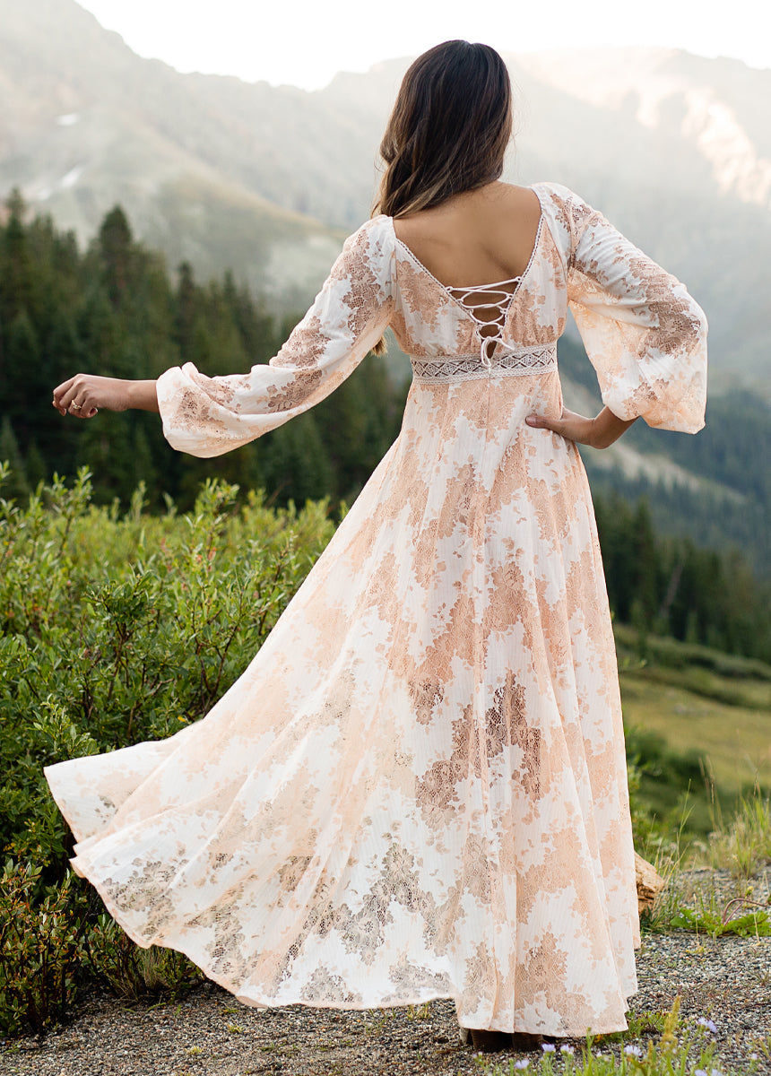 Graceful ruffles flow and sway in this romantic, versatile, off or on-shoulder boho dress.