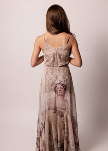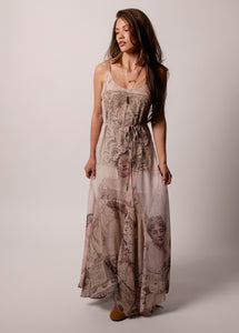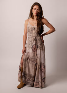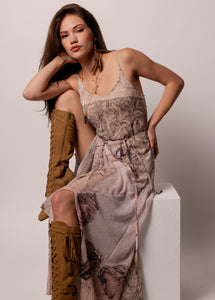 The Jainee Dress features a clean V-neckline at the front and a soft V-shaped back for a beautifully balanced silhouette. Delicate spaghetti straps add a light, airy feel while keeping the look elegant and versatile. A self-fabric drawstring tie at the front waist allows for adjustable cinching that flatters your natural shape. The flowing skirt is designed with a curved seam across the lower portion for added movement and visual interest. Soft gathers in the lower skirt create a graceful drape, making this dress perfect for warm-weather outings, brunch dates, or relaxed evenings.