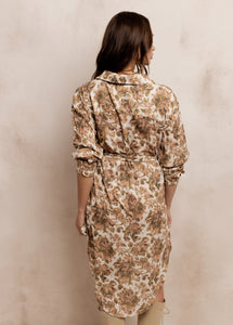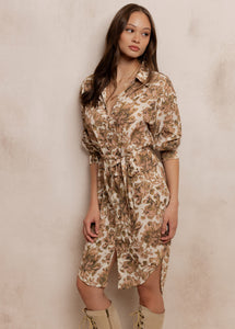 This effortlessly chic shirt dress is designed for comfort and understated style. It features a relaxed fit with a slightly dropped shoulder seam for an easy, laid-back feel. The button front with elastic loops adds a soft, feminine touch, while the high-low saddle-shaped hem creates gentle movement. Long sleeves with cuffs and a placket give it a polished finish. Complete with a self-fabric belt to define the waist, this dress transitions perfectly from casual days to elegant evenings.
