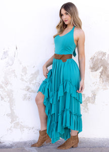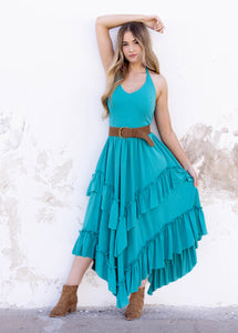 This dress features effortlessly chic designs with charming bohemian details, perfect for warm-weather outings. It features a soft scoop neckline and thin shoulder straps, creating a feminine silhouette. This halter dress with a smocked back for a comfortable, flexible fit. The tiered ruffle hemline adds playful volume and graceful movement, while the asymmetrical cut gives the dress a stylish flair. Its lightweight fabric and breezy design make it ideal for casual events or weekend strolls. Overall this dress exudes a carefree, bohemian elegance, making them versatile additions to any wardrobe.