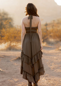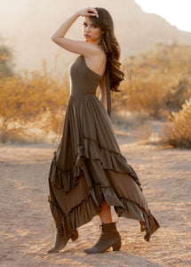 This dress features effortlessly chic designs with charming bohemian details, perfect for warm-weather outings. It features a soft scoop neckline and thin shoulder straps, creating a feminine silhouette. This halter dress with a smocked back for a comfortable, flexible fit. The tiered ruffle hemline adds playful volume and graceful movement, while the asymmetrical cut gives the dress a stylish flair. Its lightweight fabric and breezy design make it ideal for casual events or weekend strolls. Overall this dress exudes a carefree, bohemian elegance, making them versatile additions to any wardrobe.