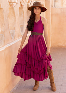 This elegant bohemian-style dress features flowing, tiered skirts adorned with cascading ruffle details, creating a romantic and whimsical silhouette. This dress showcases a halter neckline with a tie closure at the back, leading to an open-back design accentuated by a contrasting waistband that adds definition, the asymmetrical hemline enhances movement and grace making it a perfect blend of femininity and free-spirited elegance. Styled with boots and accessories, these dresses embody a dreamy, boho-chic aesthetic perfect for any whimsical occasion.