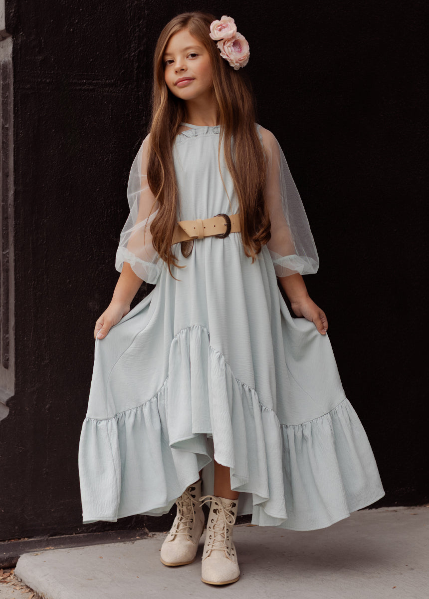 Make her feel like a princess in this stunning girls' maxi dress, perfect for her wardrobe. Featuring a high-low ruffle design and a charming ruffle hem, this dress adds playful elegance to her look. The sheer long bubble sleeves and ruffled bodice create a whimsical, dreamy feel, ideal for special occasions or everyday twirls. An elastic waistband ensures a comfortable and flexible fit, making it as practical as it is stylish. This enchanting maxi dress is a must-have for any little fashionista's wardrobe!