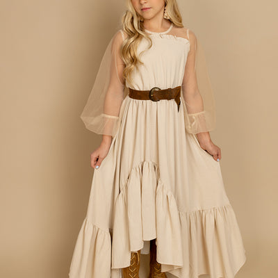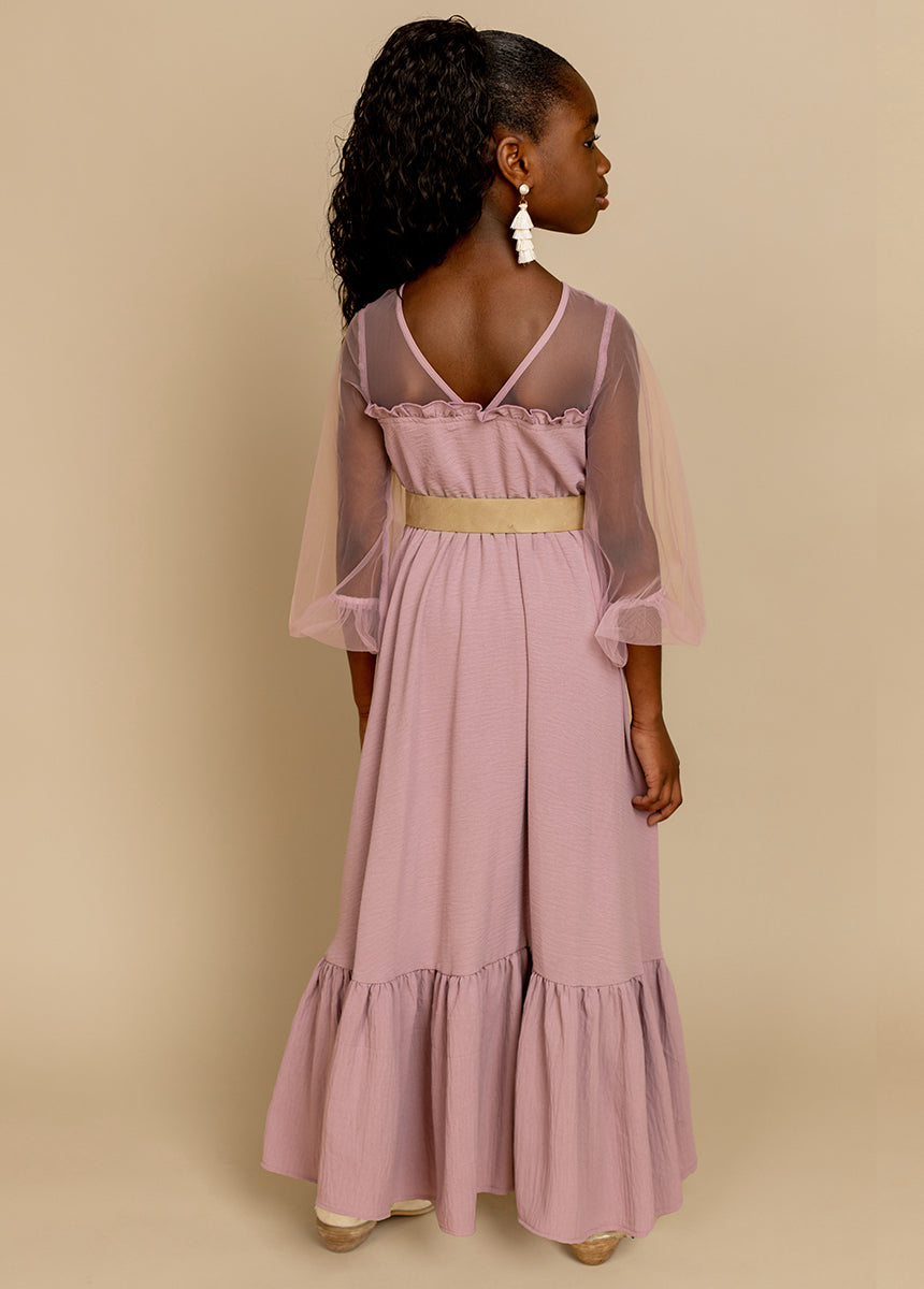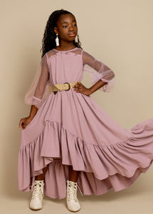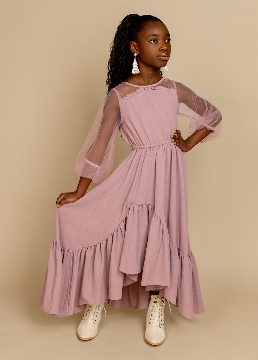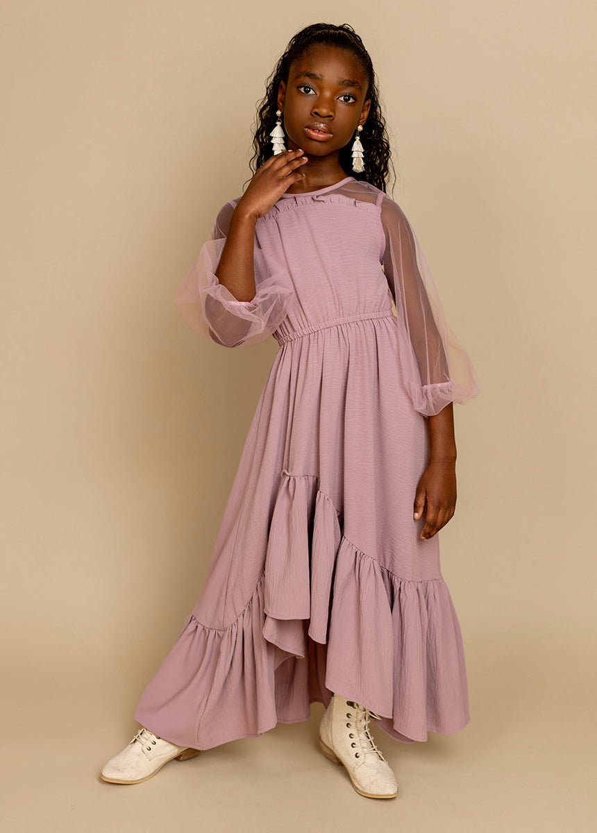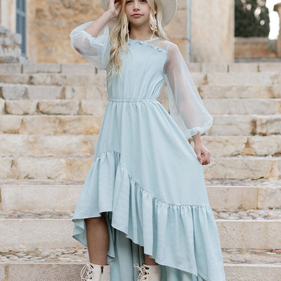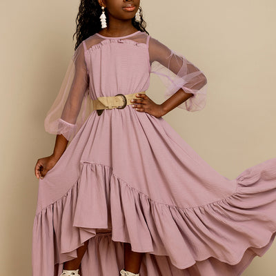 Make her feel like a princess in this stunning girls' maxi dress, perfect for her wardrobe. Featuring a high-low ruffle design and a charming ruffle hem, this dress adds playful elegance to her look. The sheer long bubble sleeves and ruffled bodice create a whimsical, dreamy feel, ideal for special occasions or everyday twirls. An elastic waistband ensures a comfortable and flexible fit, making it as practical as it is stylish. This enchanting maxi dress is a must-have for any little fashionista's wardrobe!