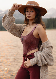 This top is crafted from soft knit fabric with a supportive power mesh lining for a smooth, flattering fit. It features a clean-finish neckline, armholes, and straps for a polished, modern look. Hidden boning provides subtle structure, while matte flat elastic with antique brass adjusters and loops adds a touch of understated elegance. The matte soft hook-and-eye trim ensures a secure yet comfortable fit, perfect for all-day wear. Designed with both style and support in mind, this versatile piece is ideal for layering or wearing on its own for an effortlessly sophisticated vibe.