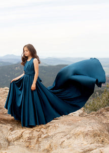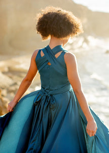 Disclaimer: This dress has been designed for fun and whimsical purposes, to delight your child as she wears it. The garment has a long train to create beautiful and impactful images, but it is not designed for unattended play, nor for use without a guardian nearby. There is a bustle to fasten the train to make it easier to walk in: simply fasten the two clear buttons on the underskirt through the loops at the waist. It is our genuine hope that your child feels special and adored while also staying safe!
