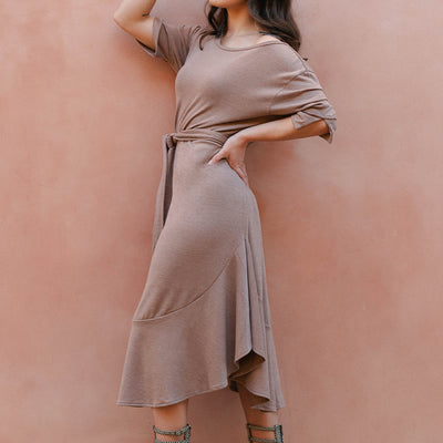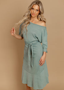 Stay cozy and chic in this sweater knit dress, a perfect addition to your clothing collection. Featuring a boat neckline and 3/4 sleeves, it offers a timeless silhouette with a modern twist. The raw edges on the neck and sleeves add a touch of effortless style, while the wide fit ensures all-day comfort. Complete with an attached self-tie belt, this dress flatters your figure and creates a polished look. Ideal for casual outings, or cooler weather, this versatile sweater dress is a must-have for any wardrobe.