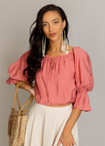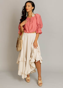 Drift into effortless elegance with our dreamy Kerra Top, a romantic blend of bohemian charm and feminine grace. Designed to be as versatile as it is enchanting.A tunneled hem offers styling versatility—wear it loose for an airy, relaxed silhouette or cinch it for a chic, cropped bubble effect. Whether paired with flowing skirts or high-waisted denim, the Kerra Top is your go-to for easy effortless styling.