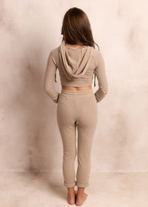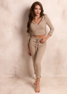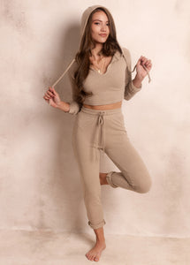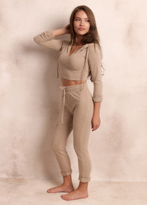 The Kiely Set brings effortless comfort and modern street-chic together in the best way. The hoodie features a soft self-fabric tie and a raw-edge front neck opening that adds a relaxed, lived-in feel. Its cropped length pairs perfectly with the high-waisted trousers for a flattering, balanced silhouette. The matching pants include a self-fabric drawstring, giving you a customized and comfortable fit. Perfect for cozy days, casual outings, or elevated loungewear looks, this set keeps you comfortable while still looking polished.