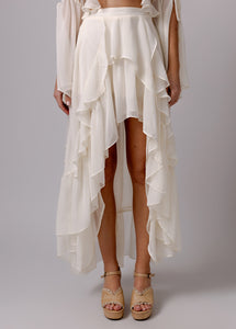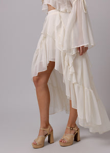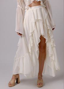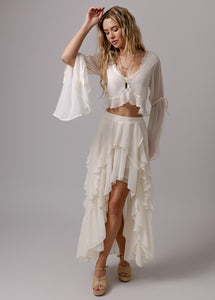 The Kori Skirt brings soft, graceful movement to your look with ruffles that fall freely from the waistband to the hem. Each ruffle drapes beautifully, creating a light, fluttery effect that feels effortlessly feminine. The curved center-front hemline adds a touch of shape and keeps the silhouette looking modern and flattering. Easy to dress up or down, it pairs perfectly with everything from simple tanks to elegant blouses. A standout piece for any boutique wardrobe, this skirt adds charm and texture to every outfit.