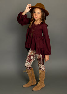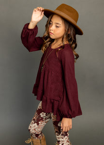 Introducing the Laila Henley Top in Plum, the ultimate wardrobe staple for your little one. This versatile long sleeve top features stylish balloon sleeves and a trendy high-low hem, making it perfect for any occasion. Crafted from cozy waffle knit fabric, it offers both comfort and style, whether dressed up or down. The lined front bodice adds an extra layer of quality and durability. Elevate her everyday look with the Laila Henley Top, a must-have addition to her collection.